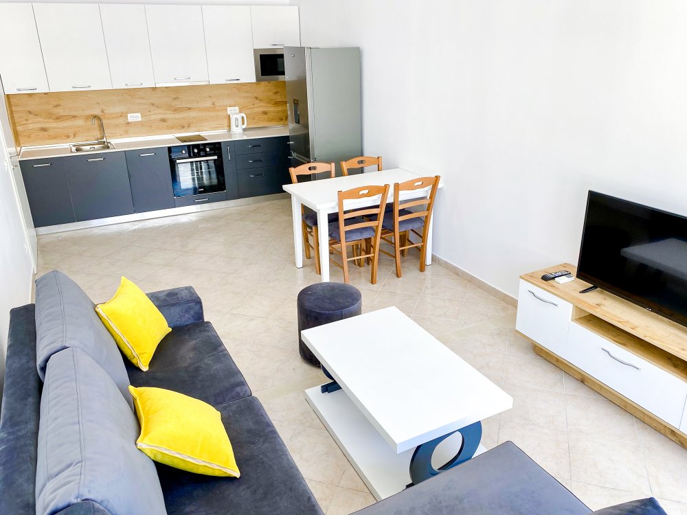 Apartmánové domy sú súčasťou moderného hotelového komplexu s komplexným vybavením vrátane bazéna a detského ihriska. Priamo oproti Shkembi Rock a Kavajes Ubytovanie v moderných kompletne zariadených apartmánoch s možnosťou využívať stravovacie služby hotela a bazén za poplatok. Krásna široká piesočnatá pláž s pozvoľným vstupom do mora s množstvom vodných atrakcií.